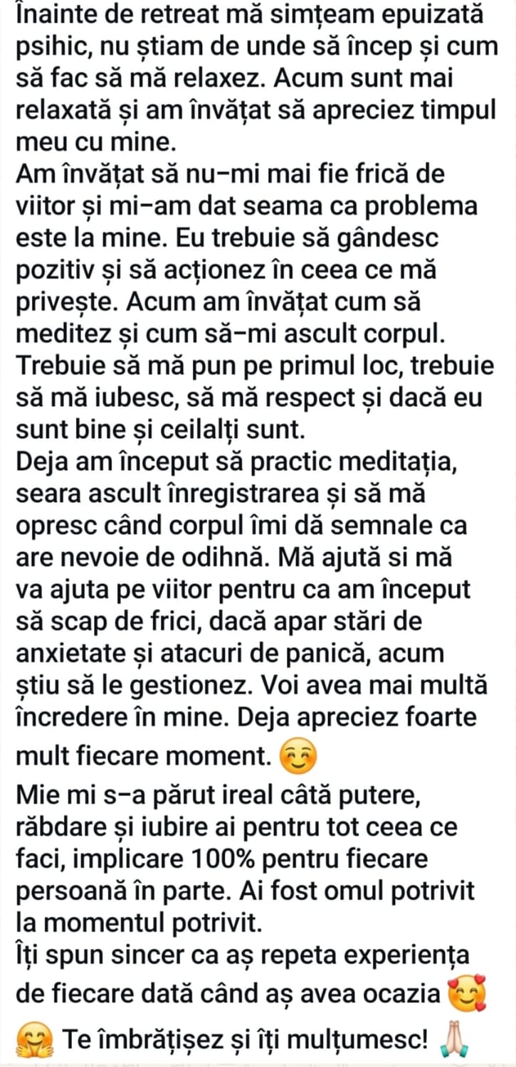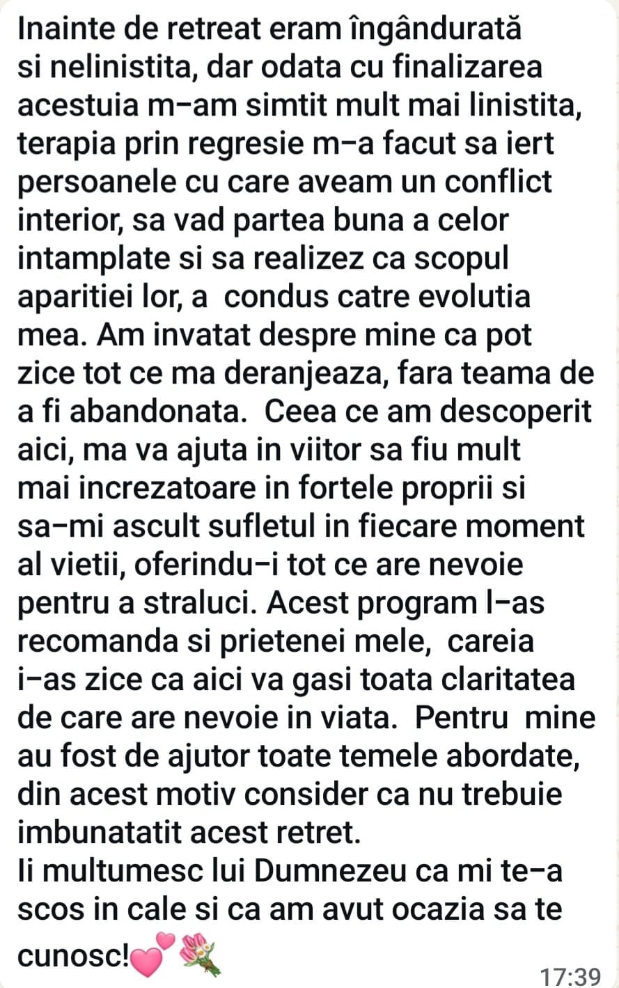 ✔ toate activitățile din program (hipnoterapie, regresie, mișcare, spa)